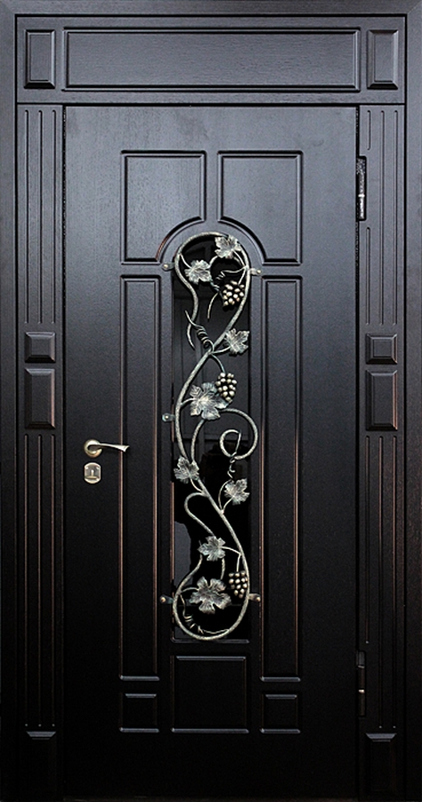 Дизайнерская входная дверь в частный дом с отделкой под дерево и решеткой №17